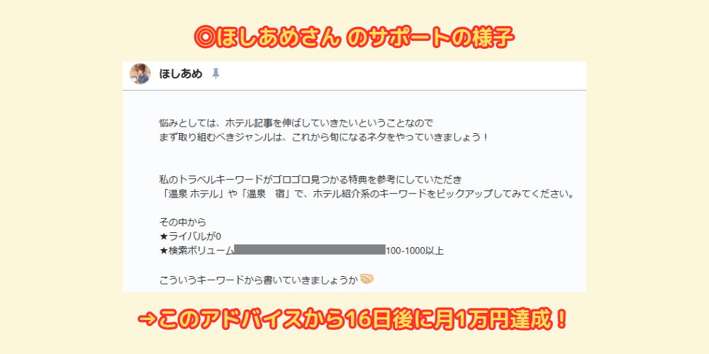 私のサポートでは、まずはワントップを見ながらブログで月1万円達成するところを重点的にお伝えしています。